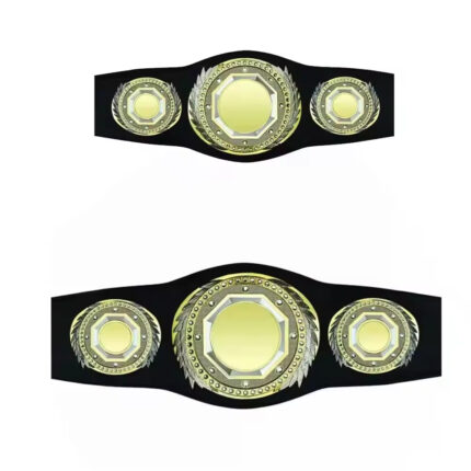 A highly ornate black leather championship belt with three polished gold plates and intricate rhinestone detailing, designed for custom branding and display.
