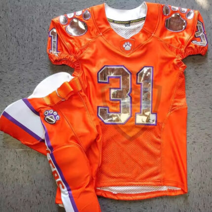 A high-energy orange uniform featuring futuristic reflective chrome accents and paw print motifs for a bold, dominant style