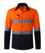 urable long-sleeve high-visibility safety work shirt in orange and navy color-block. Features two bands of reflective tape for 360-degree compliance and visibility.