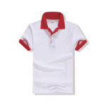 Achieve a bold, sporty, and clean look with this Classic White Polo Shirt. The main body is a crisp, bright white, providing a versatile and sharp base. The design is dramatically accented by a bright red knit collar and red trim on the cuffs (which appears to be a mesh or contrasting material). This high-contrast color scheme is perfect for team uniforms, sports clubs, or anyone looking to make a confident, energetic statement.