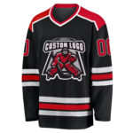 This premium hockey jersey features a dominating black base, providing a powerful, classic look for the ice. The design is accented by bold red, white, and thin gray striping across the sleeves and bottom hem, adding a high-contrast vintage feel. It features a classic lace-up neck placket, reinforcing the retro hockey aesthetic while offering adjustable comfort. The jersey is constructed from heavyweight, durable polyester mesh, designed to withstand intense play while maintaining breathability