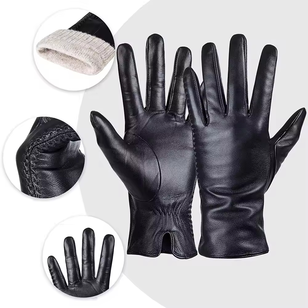 Elevate your cold-weather look with these sophisticated black gloves. Crafted from a soft, supple leather-look material, they offer a comfortable and flattering fit. The distinguishing feature is the exquisite hand-stitched braiding or piping running along the outer seam of the glove, adding a refined, tailored detail that sets them apart from basic styles. The wrist features a subtle vent or keyhole cutout, ensuring ease of wear and a clean, elegant silhouette suitable for both casual and dressier occasions.