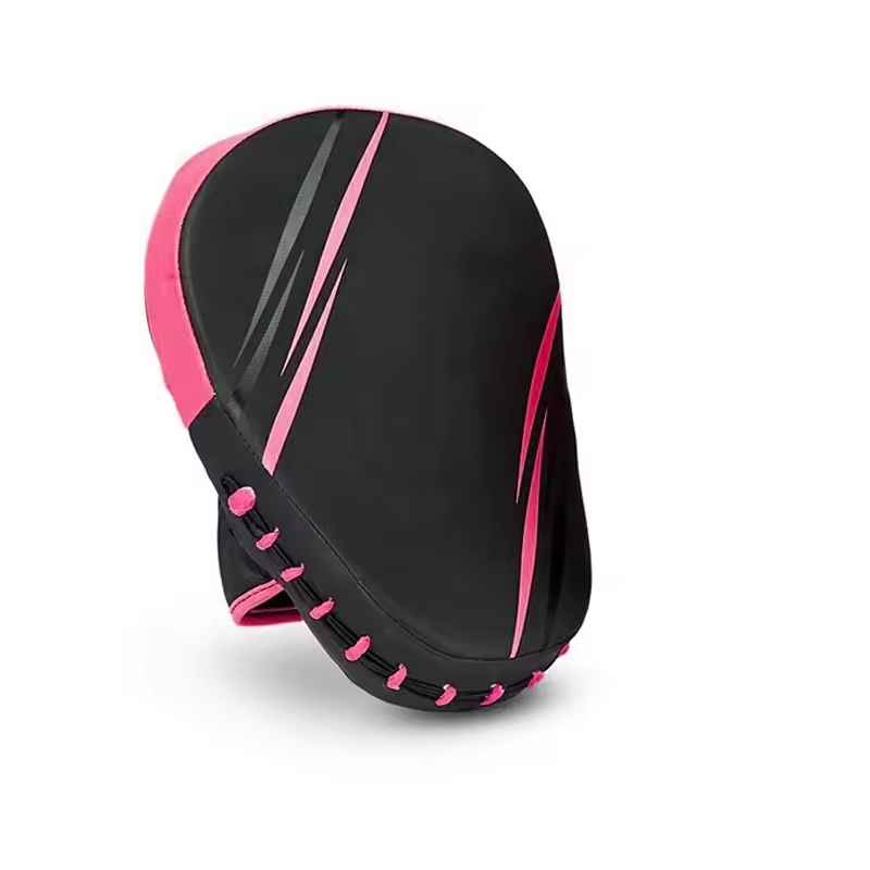 Contoured, lightweight focus mitts in black and pink, designed for exceptional speed training, shock absorption, and precision targeting.