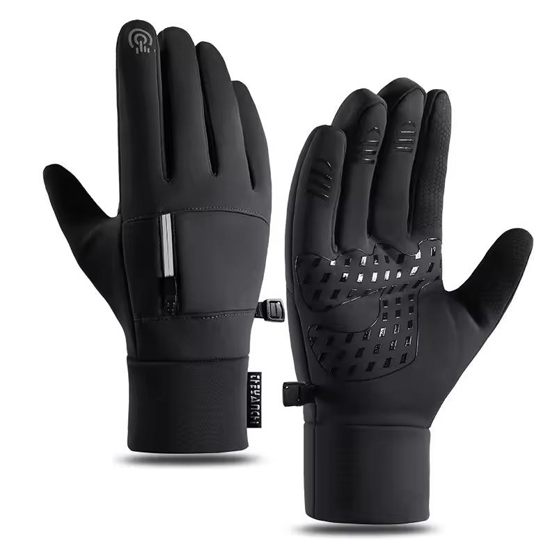 Black insulated winter gloves with full-palm silicone grip, touchscreen capability, and a wrist strap with a toggle buckle for secure cold-weather activity.