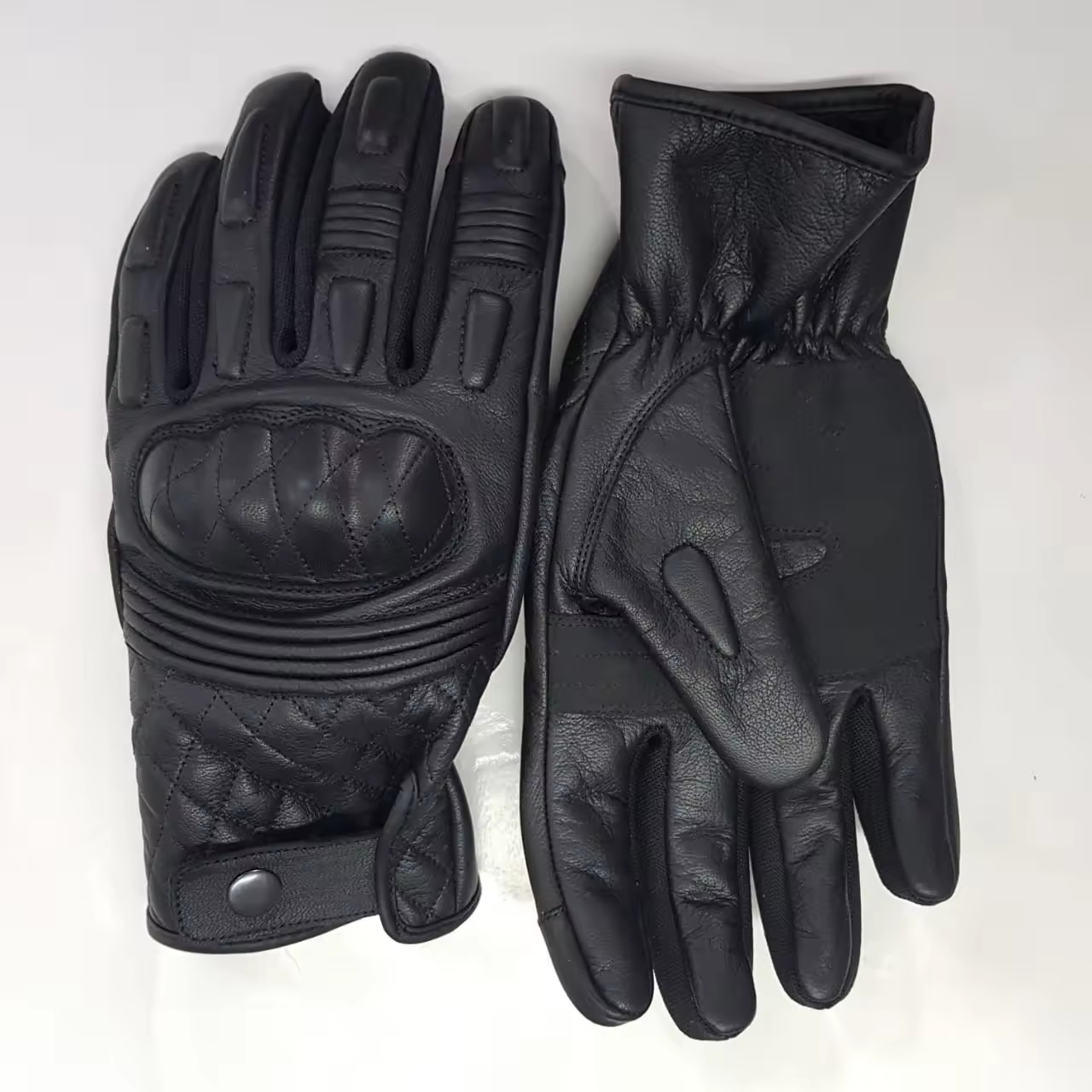 Engineered for the open road, these gloves offer the perfect blend of style, comfort, and crucial protection for riders. Constructed from durable, high-quality black leather, the design features essential protective padding on the knuckles and fingers, along with a distinct quilted diamond pattern on the palm area for enhanced grip and vibration dampening. The short cuff includes a ventilation hole (keyhole vent) and is designed for a secure, comfortable fit that integrates well with your riding jacket. Perforated details on the back of the hand aid in airflow, making them suitable for three-season riding where both protection and comfort are essential.