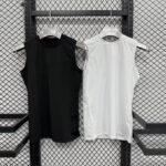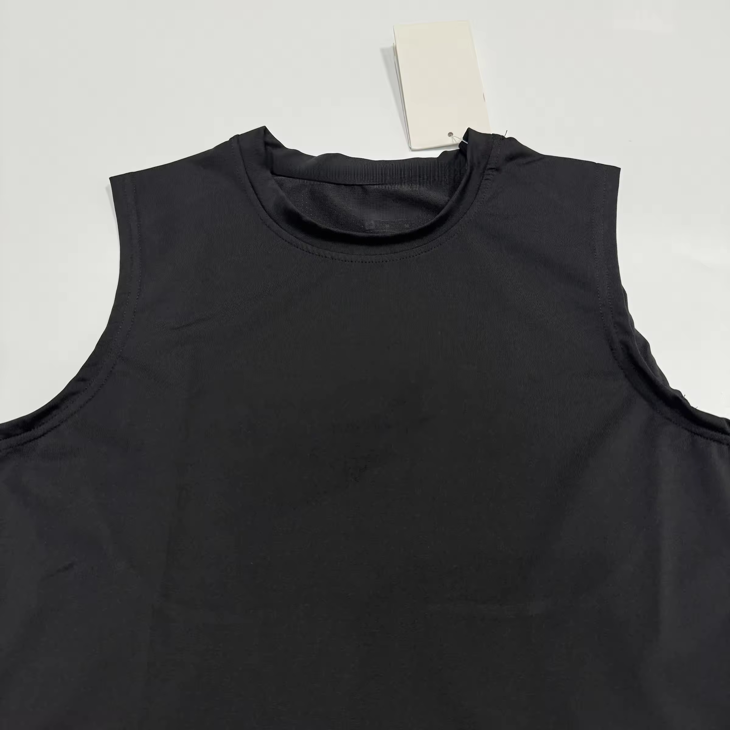 Sleek black sleeveless top with a high crew neck. Made from lightweight, moisture-wicking performance fabric. Ideal for gym training, running, and modern activewear.