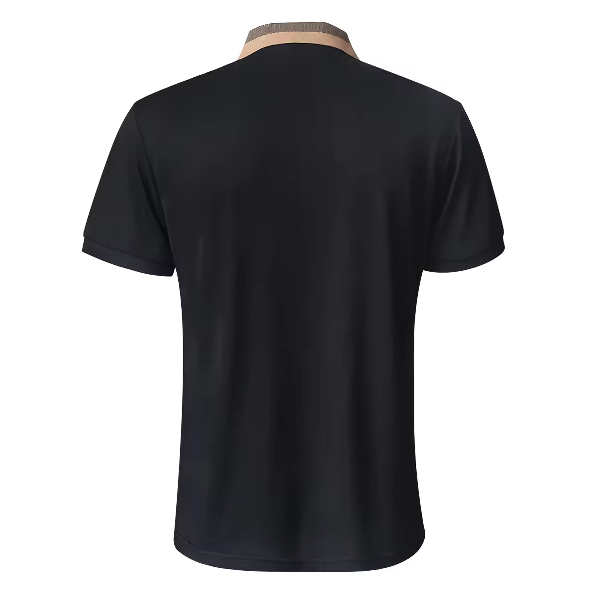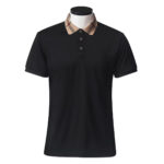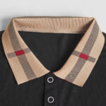 Elevate the classic polo silhouette with this Sophisticated Black Polo Shirt, featuring a standout patterned collar for a distinctive look. The body is a deep, solid black, crafted from a smooth, comfortable fabric. The collar provides an immediate touch of luxury and contrast with its beige base and traditional plaid (or check) pattern, reminiscent of classic luxury brands.