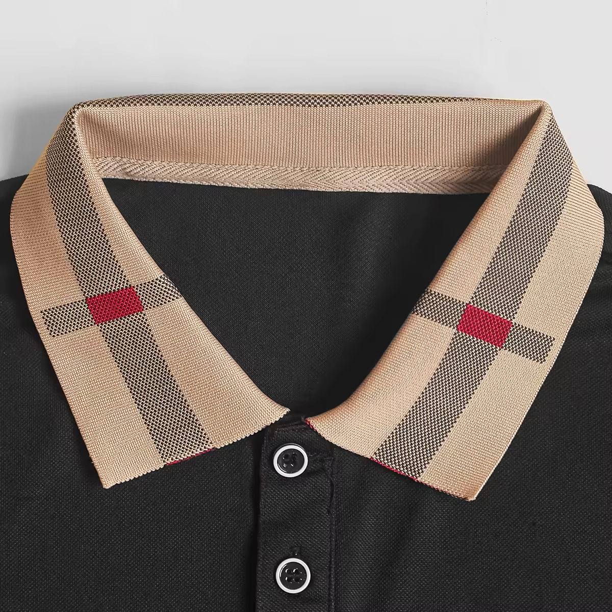 Classic black short-sleeve polo featuring a distinctive beige and plaid (or check) patterned collar. Three-button placket for a sophisticated, smart-casual look