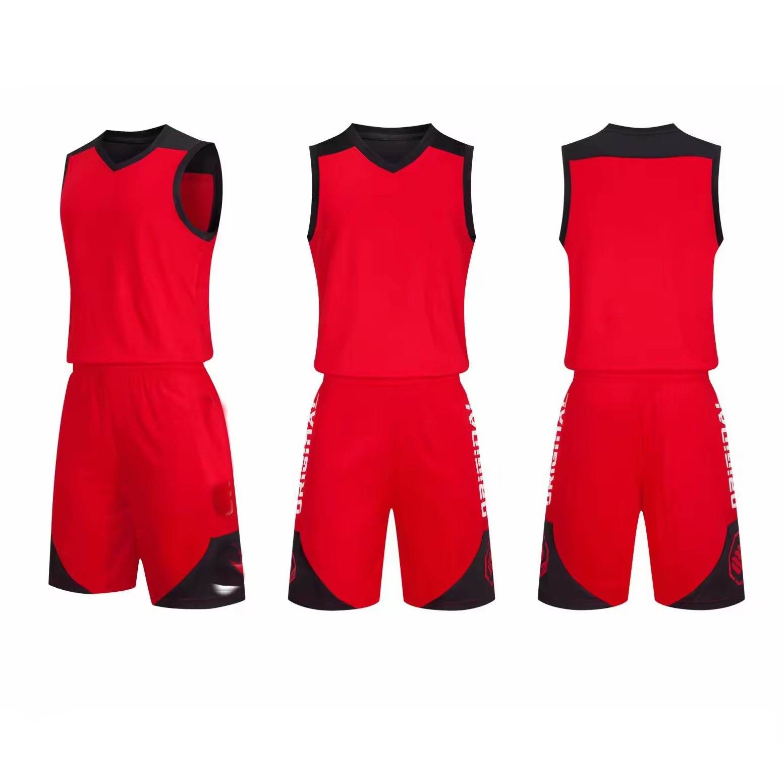 This collection features three color variations of a high-performance basketball uniform designed for team practice and competitive play. Each jersey and short set utilizes a moisture-management, lightweight mesh fabric for superior ventilation and rapid drying. The design is characterized by a sleek V-neck, bold contrast trim along the armholes and neckline, and striking geometric side panel inserts in white, yellow, and blue. The shorts feature matching color patterns and are cut for athletic mobility. The set includes: a Primary Blue uniform with yellow accents; a Classic White uniform with yellow and blue accents; and an Alternate Black uniform with yellow and blue accents. This versatility ensures teams have options for home, away, and practice use while maintaining a cohesive and modern athletic aesthetic.
